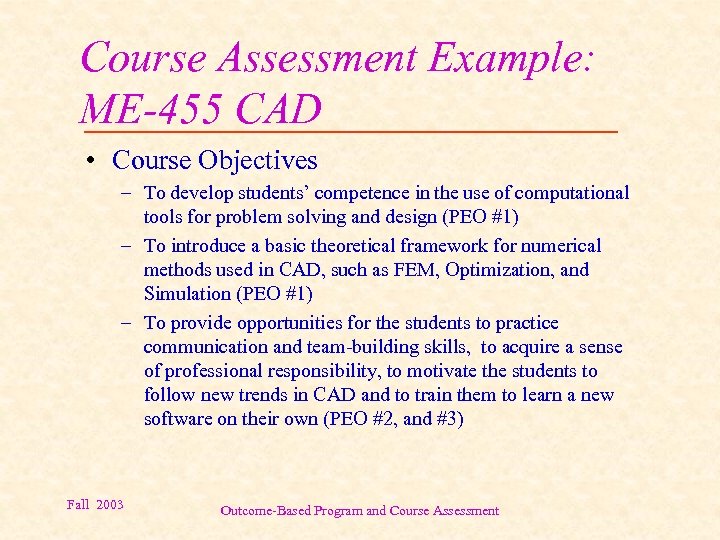 Course Assessment Example: ME-455 CAD • Course Objectives – To develop students’ competence in the use of computational tools for problem solving and design (PEO #1) – To introduce a basic theoretical framework for numerical methods used in CAD, such as FEM, Optimization, and Simulation (PEO #1) – To provide opportunities for the students to practice communication and team-building skills, to acquire a sense of professional responsibility, to motivate the students to follow new trends in CAD and to train them to learn a new software on their own (PEO #2, and #3) Fall 2003 Outcome-Based Program and Course Assessment