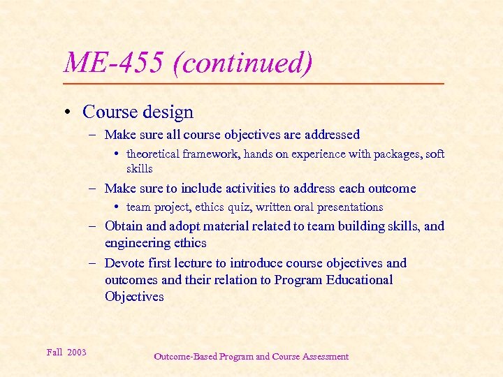 ME-455 (continued) • Course design – Make sure all course objectives are addressed • theoretical framework, hands on experience with packages, soft skills – Make sure to include activities to address each outcome • team project, ethics quiz, written oral presentations – Obtain and adopt material related to team building skills, and engineering ethics – Devote first lecture to introduce course objectives and outcomes and their relation to Program Educational Objectives Fall 2003 Outcome-Based Program and Course Assessment