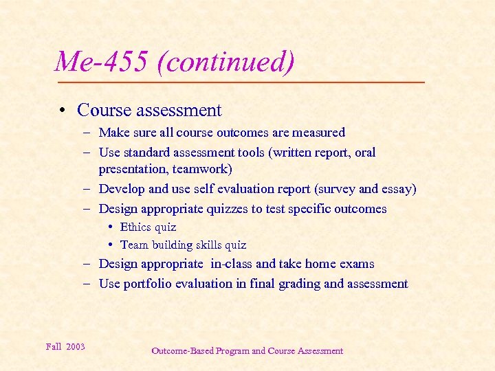 Me-455 (continued) • Course assessment – Make sure all course outcomes are measured – Use standard assessment tools (written report, oral presentation, teamwork) – Develop and use self evaluation report (survey and essay) – Design appropriate quizzes to test specific outcomes • Ethics quiz • Team building skills quiz – Design appropriate in-class and take home exams – Use portfolio evaluation in final grading and assessment Fall 2003 Outcome-Based Program and Course Assessment