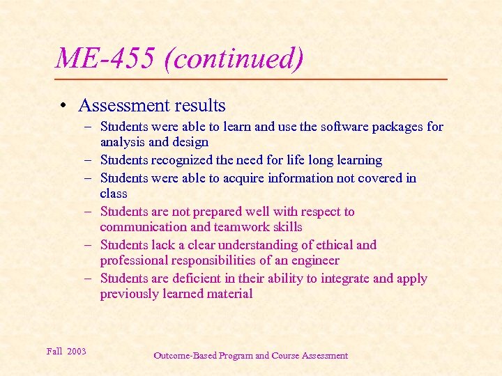 ME-455 (continued) • Assessment results – Students were able to learn and use the software packages for analysis and design – Students recognized the need for life long learning – Students were able to acquire information not covered in class – Students are not prepared well with respect to communication and teamwork skills – Students lack a clear understanding of ethical and professional responsibilities of an engineer – Students are deficient in their ability to integrate and apply previously learned material Fall 2003 Outcome-Based Program and Course Assessment