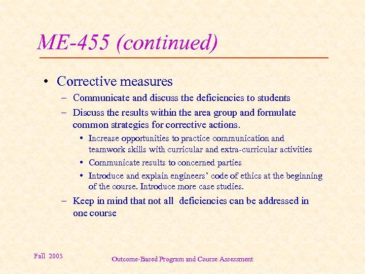 ME-455 (continued) • Corrective measures – Communicate and discuss the deficiencies to students – Discuss the results within the area group and formulate common strategies for corrective actions. • Increase opportunities to practice communication and teamwork skills with curricular and extra-curricular activities • Communicate results to concerned parties • Introduce and explain engineers’ code of ethics at the beginning of the course. Introduce more case studies. – Keep in mind that not all deficiencies can be addressed in one course Fall 2003 Outcome-Based Program and Course Assessment