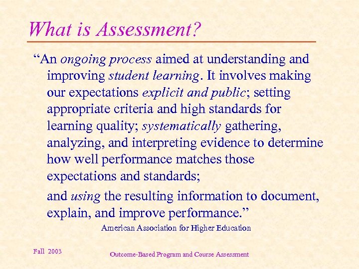 What is Assessment? “An ongoing process aimed at understanding and improving student learning. It involves making our expectations explicit and public; setting appropriate criteria and high standards for learning quality; systematically gathering, analyzing, and interpreting evidence to determine how well performance matches those expectations and standards; and using the resulting information to document, explain, and improve performance. ” American Association for Higher Education Fall 2003 Outcome-Based Program and Course Assessment
