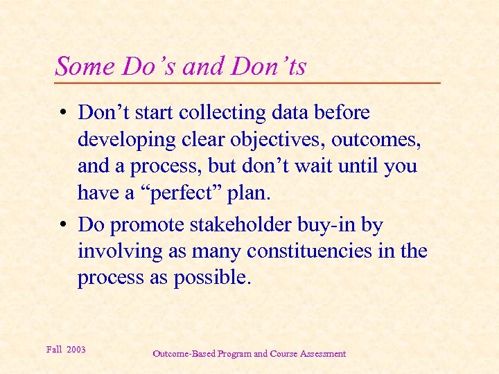 Some Do’s and Don’ts • Don’t start collecting data before developing clear objectives, outcomes, and a process, but don’t wait until you have a “perfect” plan. • Do promote stakeholder buy-in by involving as many constituencies in the process as possible. Fall 2003 Outcome-Based Program and Course Assessment