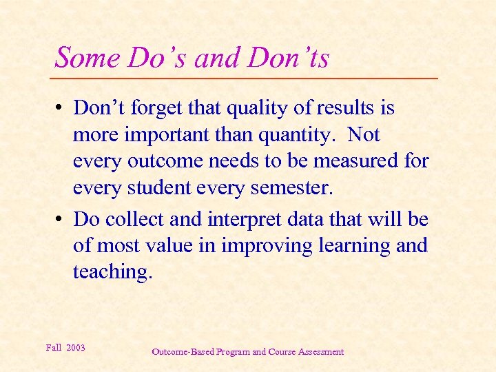 Some Do’s and Don’ts • Don’t forget that quality of results is more important than quantity. Not every outcome needs to be measured for every student every semester. • Do collect and interpret data that will be of most value in improving learning and teaching. Fall 2003 Outcome-Based Program and Course Assessment
