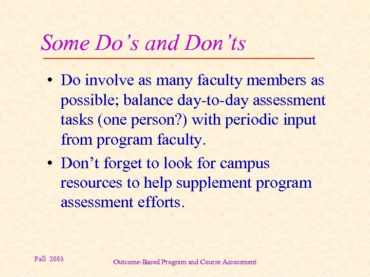 Some Do’s and Don’ts • Do involve as many faculty members as possible; balance day-to-day assessment tasks (one person? ) with periodic input from program faculty. • Don’t forget to look for campus resources to help supplement program assessment efforts. Fall 2003 Outcome-Based Program and Course Assessment