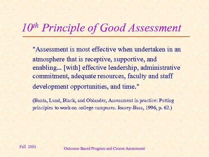 10 th Principle of Good Assessment "Assessment is most effective when undertaken in an atmosphere that is receptive, supportive, and enabling. . . [with] effective leadership, administrative commitment, adequate resources, faculty and staff development opportunities, and time. " (Banta, Lund, Black, and Oblander, Assessment in practice: Putting principles to work on college campuses. Jossey-Bass, 1996, p. 62. ) Fall 2003 Outcome-Based Program and Course Assessment