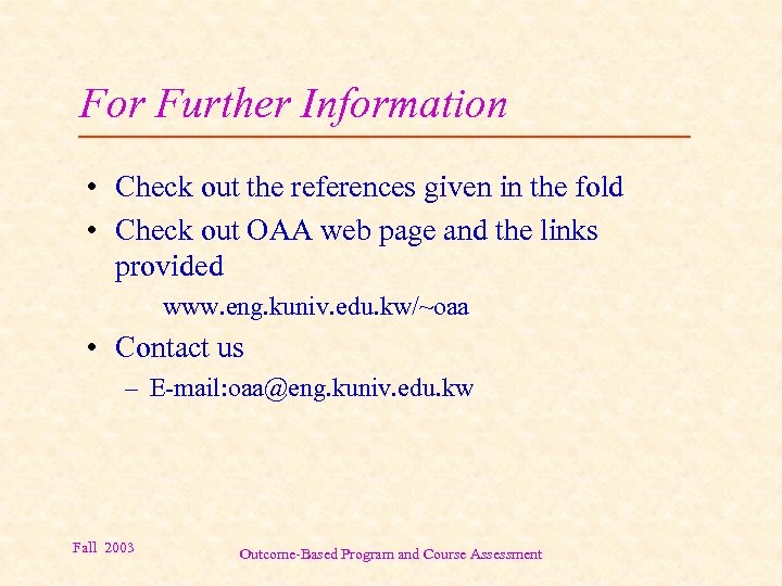 For Further Information • Check out the references given in the fold • Check out OAA web page and the links provided www. eng. kuniv. edu. kw/~oaa • Contact us – E-mail: oaa@eng. kuniv. edu. kw Fall 2003 Outcome-Based Program and Course Assessment