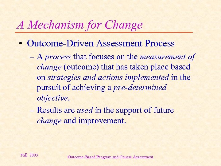 A Mechanism for Change • Outcome-Driven Assessment Process – A process that focuses on the measurement of change (outcome) that has taken place based on strategies and actions implemented in the pursuit of achieving a pre-determined objective. – Results are used in the support of future change and improvement. Fall 2003 Outcome-Based Program and Course Assessment