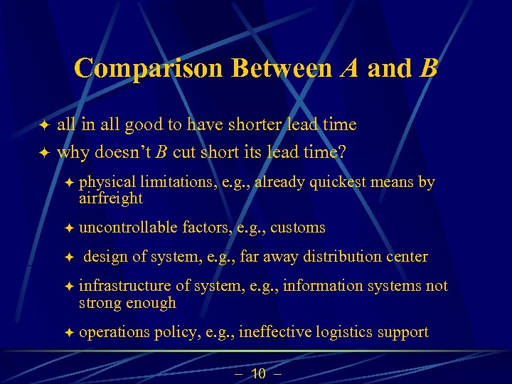 Comparison Between A and B ö ö all in all good to have shorter lead time why doesn’t B cut short its lead time? ö physical limitations, e. g. , already quickest means by airfreight ö uncontrollable factors, e. g. , customs ö design of system, e. g. , far away distribution center ö infrastructure of system, e. g. , information systems not strong enough ö operations policy, e. g. , ineffective logistics support 10