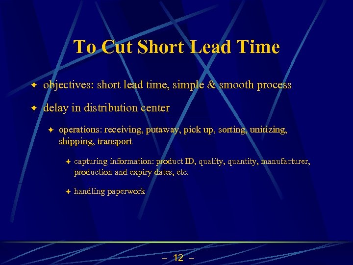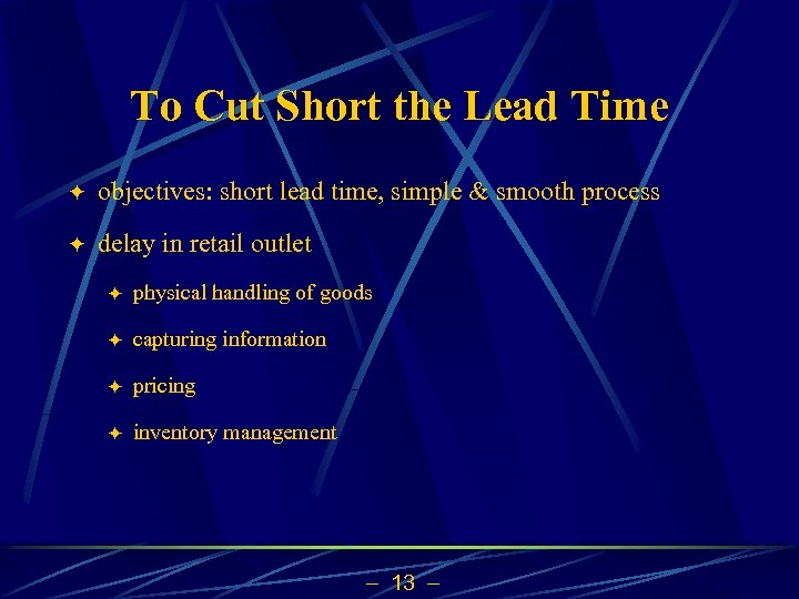 To Cut Short Lead Time ö objectives: short lead time, simple & smooth process ö delay in distribution center ö operations: receiving, putaway, pick up, sorting, unitizing, shipping, transport ö capturing information: product ID, quality, quantity, manufacturer, production and expiry dates, etc. ö handling paperwork 12
