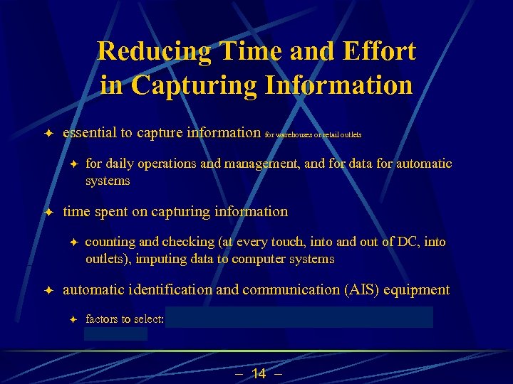 To Cut Short the Lead Time ö objectives: short lead time, simple & smooth process ö delay in retail outlet ö physical handling of goods ö capturing information ö pricing ö inventory management 13