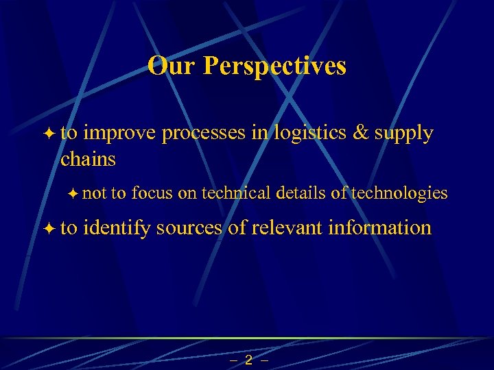 Our Perspectives ö to improve processes in logistics & supply chains ö not ö to to focus on technical details of technologies identify sources of relevant information 2