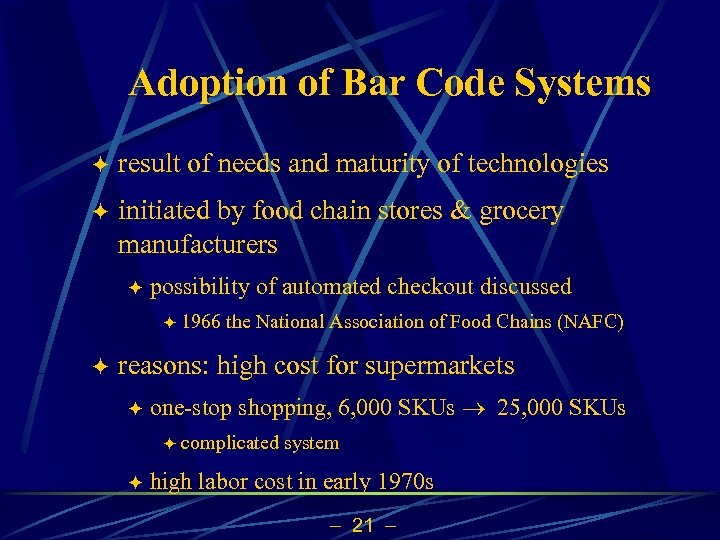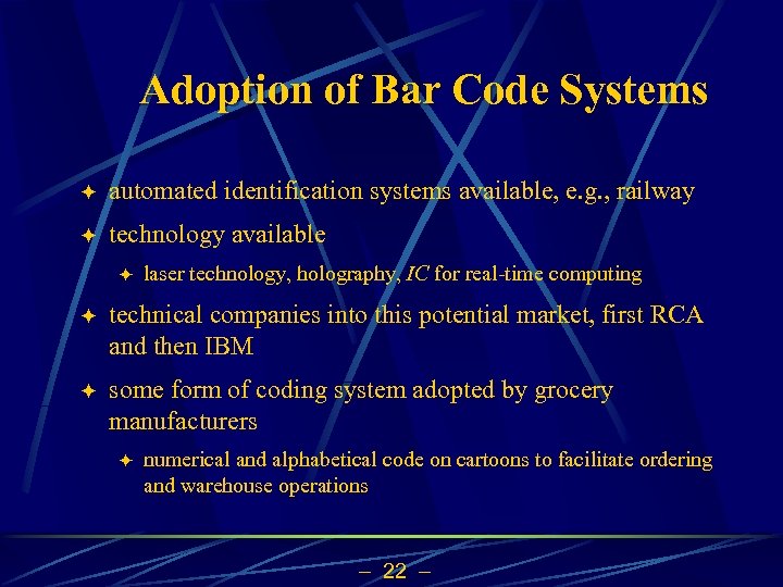 Adoption of Bar Code Systems ö result of needs and maturity of technologies ö initiated by food chain stores & grocery manufacturers ö possibility of automated checkout discussed ö 1966 ö the National Association of Food Chains (NAFC) reasons: high cost for supermarkets ö one-stop shopping, 6, 000 SKUs 25, 000 SKUs ö complicated ö system high labor cost in early 1970 s 21