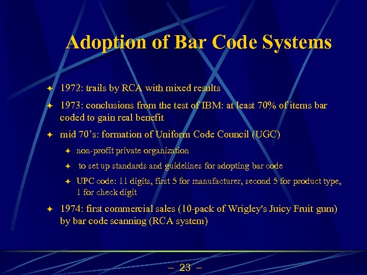 Adoption of Bar Code Systems ö automated identification systems available, e. g. , railway ö technology available ö laser technology, holography, IC for real-time computing ö technical companies into this potential market, first RCA and then IBM ö some form of coding system adopted by grocery manufacturers ö numerical and alphabetical code on cartoons to facilitate ordering and warehouse operations 22