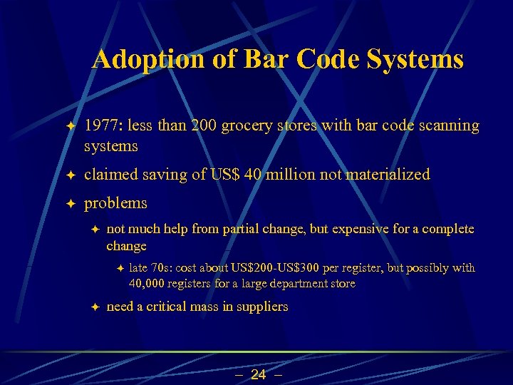 Adoption of Bar Code Systems ö 1977: less than 200 grocery stores with bar code scanning systems ö claimed saving of US$ 40 million not materialized ö problems ö not much help from partial change, but expensive for a complete change ö ö late 70 s: cost about US$200 -US$300 per register, but possibly with 40, 000 registers for a large department store need a critical mass in suppliers 24