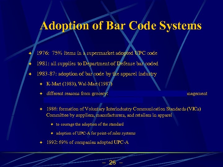 Adoption of Bar Code Systems ö benefits for retailers ö quicker in checking out ö shorter waiting line ö less checkers ö ö less errors ö ö simpler training for part-time checkers of high turnaround automatic data collection to accounting and inventory management systems benefits for manufacturers: better sales information, less out of stock 25