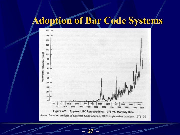 Adoption of Bar Code Systems ö 1976: 75% items in a supermarket adopted UPC code ö 1981: all supplies to Department of Defense bar coded ö 1983 -87: adoption of bar code by the apparel industry ö K-Mart (1983), Wal-Mart (1987) ö different reasons from grocery: product identification and inventory management to handle the huge product variety ö 1986: formation of Voluntary Interindustry Communication Standards (VICs) Committee by suppliers, manufacturers, and retailers in apparel ö ö ö to courage the adoption of the standard adoption of UPC-A for point-of sales systems 1992: 69% of companies adopted UPC-A 26