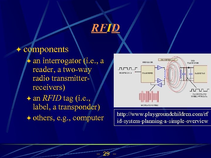 R F ID ö components ö an interrogator (i. e. , a reader, a two-way radio transmitterreceivers) ö an RFID tag (i. e. , label, a transponder) ö others, e. g. , computer 29 http: //www. playgroundchildren. com/rf id-system-planning-a-simple-overview