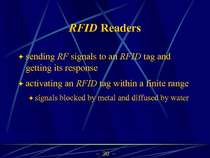 RFID Readers ö sending RF signals to an RFID tag and getting its response ö activating ö signals an RFID tag within a finite range blocked by metal and diffused by water 30