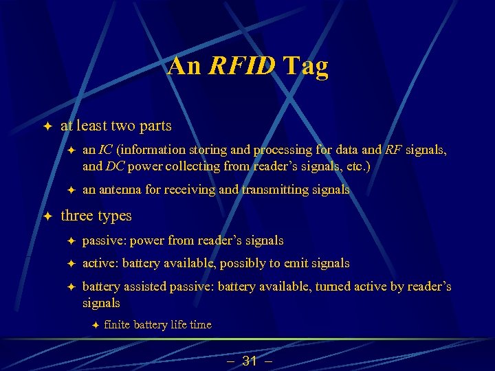 An RFID Tag ö at least two parts ö ö ö an IC (information storing and processing for data and RF signals, and DC power collecting from reader’s signals, etc. ) an antenna for receiving and transmitting signals three types ö passive: power from reader’s signals ö active: battery available, possibly to emit signals ö battery assisted passive: battery available, turned active by reader’s signals ö finite battery life time 31