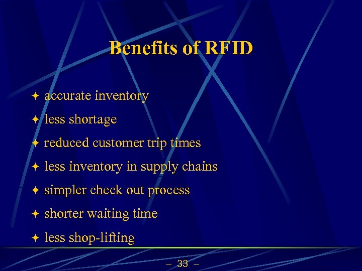 RFID ö RFID (when compared with Bar Code) ö no contact for reading ö quicker in reading ö tags can be placed anywhere ö error free reading ö robust: moving; dirty, oily surfaces; any material ö long life for passive RFID tags ö hard to fake RFID tags ö read-write tags are intelligent ö store a great amount of data ö tags can be read or written 32