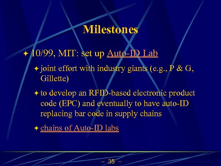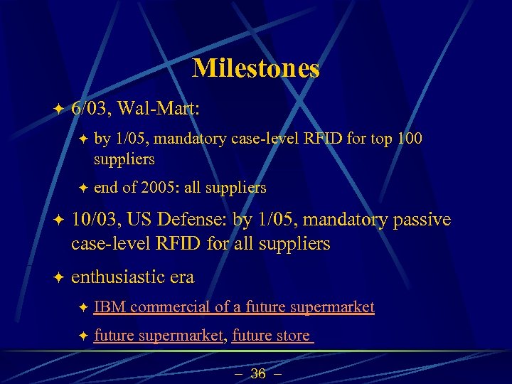 Milestones ö 10/99, MIT: set up Auto-ID Lab ö joint effort with industry giants (e. g. , P & G, Gillette) ö to develop an RFID-based electronic product code (EPC) and eventually to have auto-ID replacing bar code in supply chains ö chains of Auto-ID labs 35