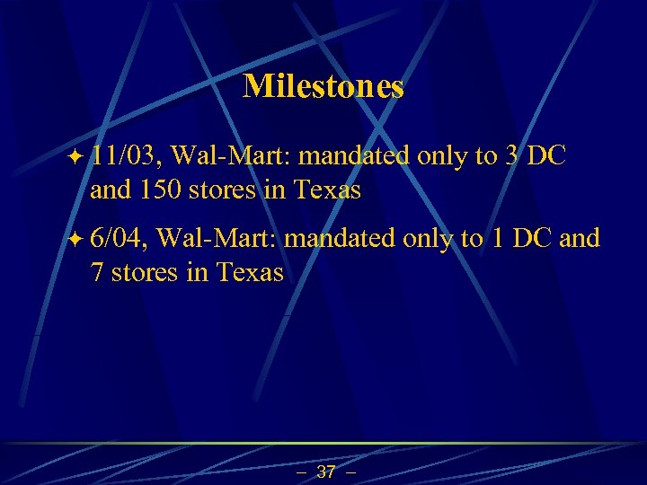 Milestones ö 11/03, Wal-Mart: mandated only to 3 DC and 150 stores in Texas ö 6/04, Wal-Mart: mandated only to 1 DC and 7 stores in Texas 37