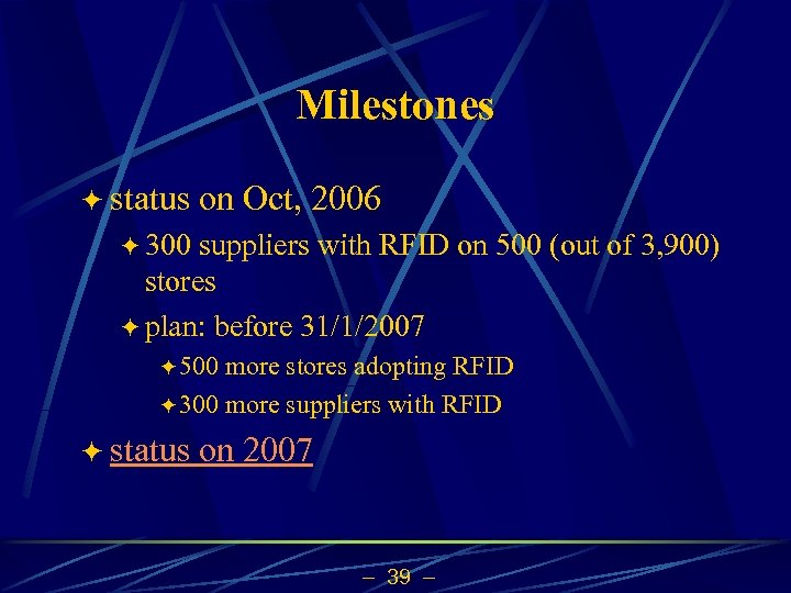 Milestones ö 9/05, Wal-Mart: completion of a test ö 29 -week study ö 12 pilot stores with RFID vs 12 stores without ö out-of-stock rates on for about 4, 000 SKUs tags at the case and pallet level ö results: for average sales rate of ö 0. 1 units/day: no effect ö 0. 1 to 2 units/day: out-of-stocks rate reduced by 32% ö 6 to 15 units/day: out-of-stocks rate reduced by 62% ö 15 or more units/day: no improvement 38