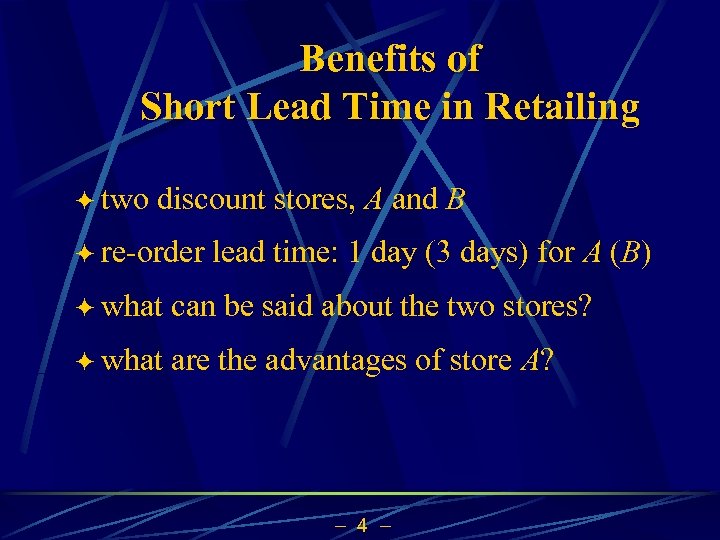 Benefits of Short Lead Time in Retailing ö two discount stores, A and B ö re-order lead time: 1 day (3 days) for A (B) ö what can be said about the two stores? ö what are the advantages of store A? 4