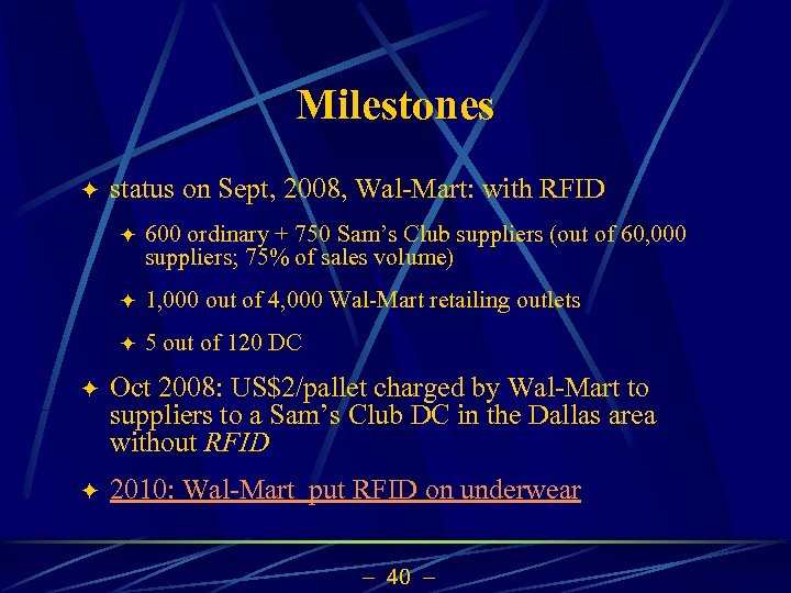 Milestones ö status on Sept, 2008, Wal-Mart: with RFID ö 600 ordinary + 750 Sam’s Club suppliers (out of 60, 000 suppliers; 75% of sales volume) ö 1, 000 out of 4, 000 Wal-Mart retailing outlets ö 5 out of 120 DC ö Oct 2008: US$2/pallet charged by Wal-Mart to suppliers to a Sam’s Club DC in the Dallas area without RFID ö 2010: Wal-Mart put RFID on underwear 40