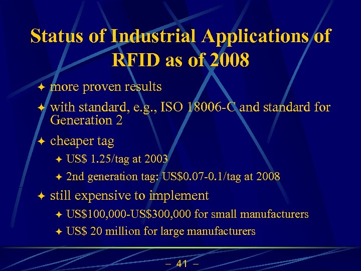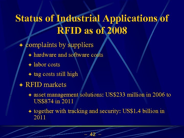 Status of Industrial Applications of RFID as of 2008 more proven results ö with standard, e. g. , ISO 18006 -C and standard for Generation 2 ö cheaper tag ö US$ 1. 25/tag at 2003 ö 2 nd generation tag: US$0. 07 -0. 1/tag at 2008 ö ö still expensive to implement US$100, 000 -US$300, 000 for small manufacturers ö US$ 20 million for large manufacturers ö 41