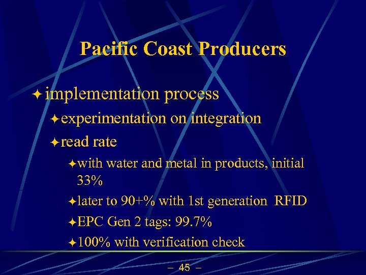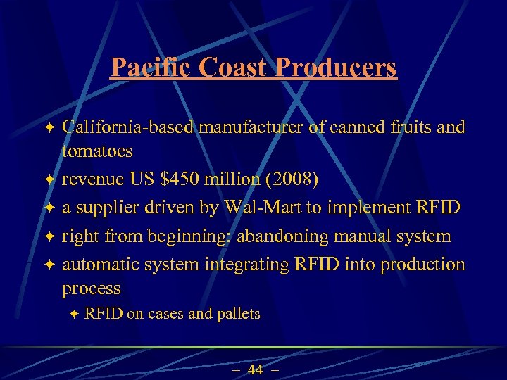 Pacific Coast Producers California-based manufacturer of canned fruits and tomatoes ö revenue US $450 million (2008) ö a supplier driven by Wal-Mart to implement RFID ö right from beginning: abandoning manual system ö automatic system integrating RFID into production process ö ö RFID on cases and pallets 44