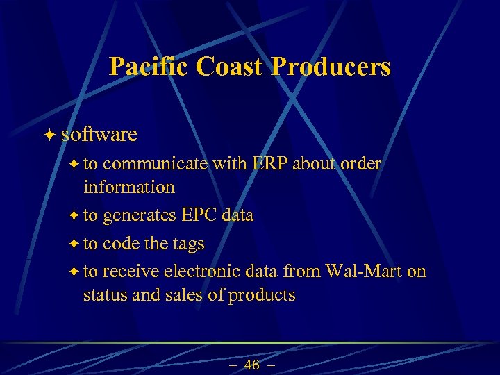 Pacific Coast Producers ö software ö to communicate with ERP about order information ö to generates EPC data ö to code the tags ö to receive electronic data from Wal-Mart on status and sales of products 46