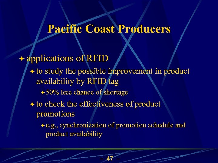 Pacific Coast Producers ö applications of RFID ö to study the possible improvement in product availability by RFID tag ö 50% less chance of shortage ö to check the effectiveness of product promotions ö e. g. , synchronization of promotion schedule and product availability 47