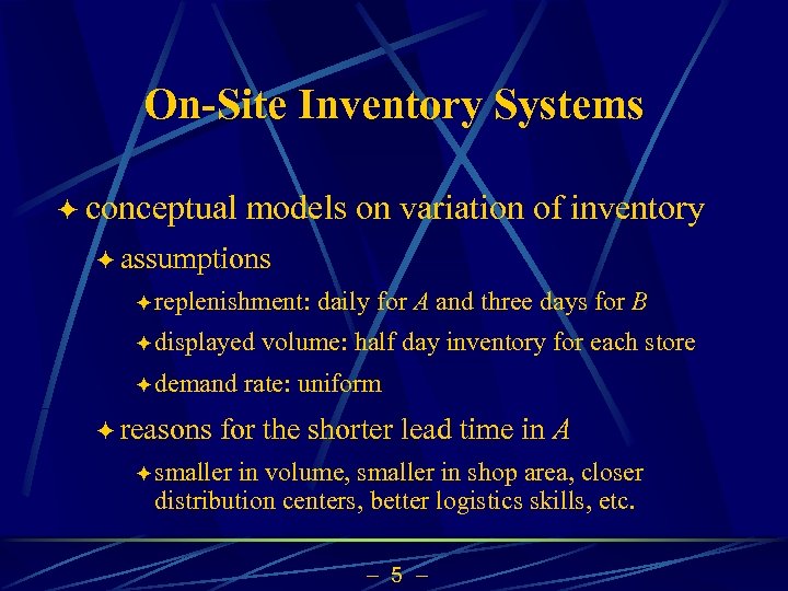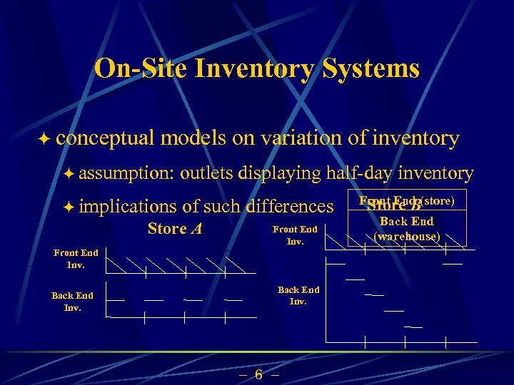 On-Site Inventory Systems ö conceptual models on variation of inventory ö assumptions ö replenishment: ö displayed ö demand ö reasons daily for A and three days for B volume: half day inventory for each store rate: uniform for the shorter lead time in A ö smaller in volume, smaller in shop area, closer distribution centers, better logistics skills, etc. 5