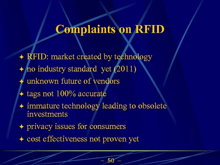 Complaints on RFID: market created by technology ö no industry standard yet (2011) ö unknown future of vendors ö tags not 100% accurate ö immature technology leading to obsolete investments ö privacy issues for consumers ö cost effectiveness not proven yet ö 50