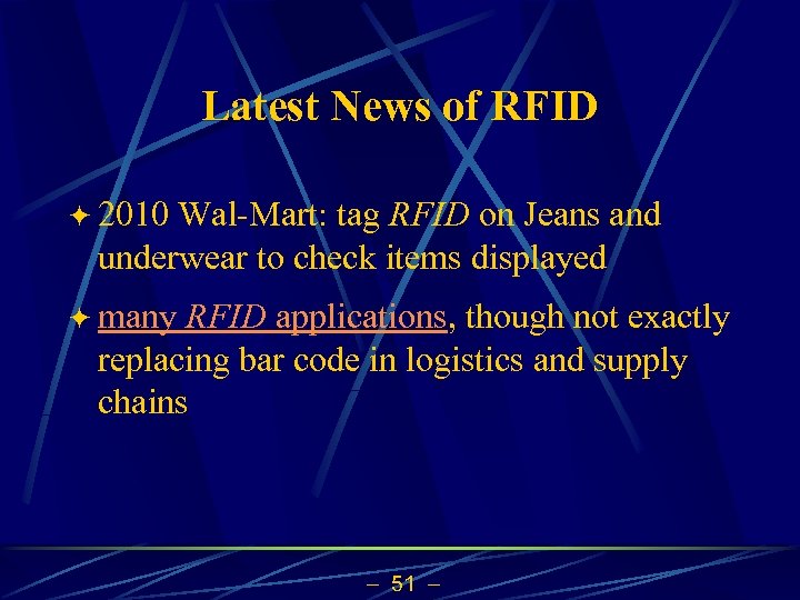 Latest News of RFID ö 2010 Wal-Mart: tag RFID on Jeans and underwear to check items displayed ö many RFID applications, though not exactly replacing bar code in logistics and supply chains 51