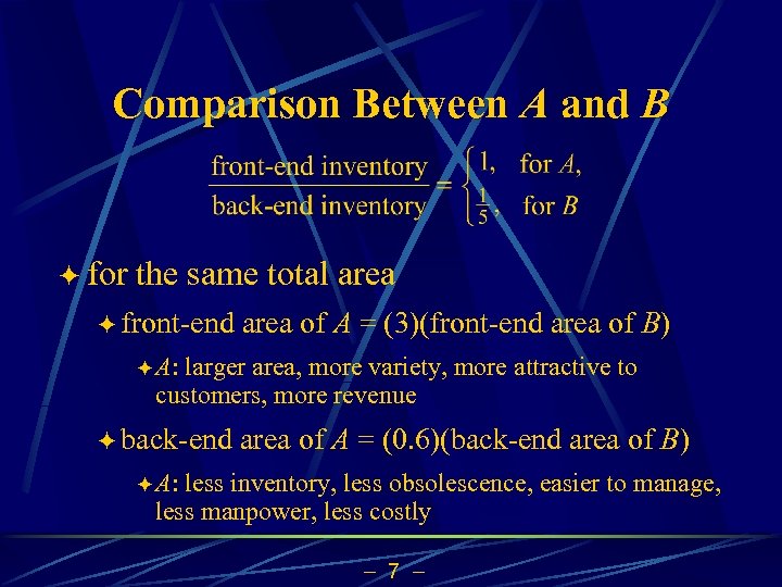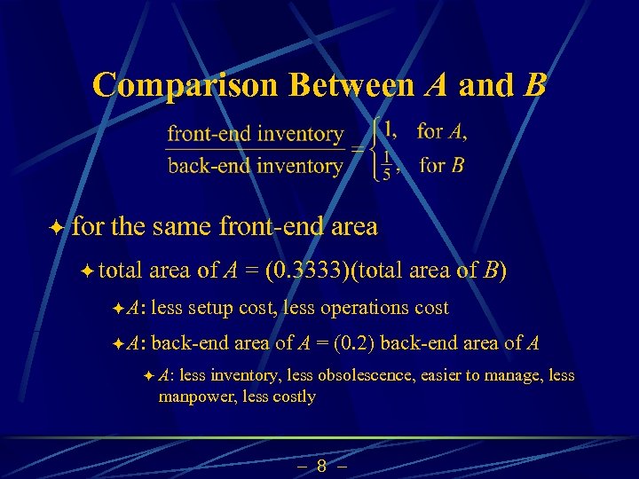 Comparison Between A and B ö for the same total area ö front-end area of A = (3)(front-end area of B) ö A: larger area, more variety, more attractive to customers, more revenue ö back-end area of A = (0. 6)(back-end area of B) ö A: less inventory, less obsolescence, easier to manage, less manpower, less costly 7