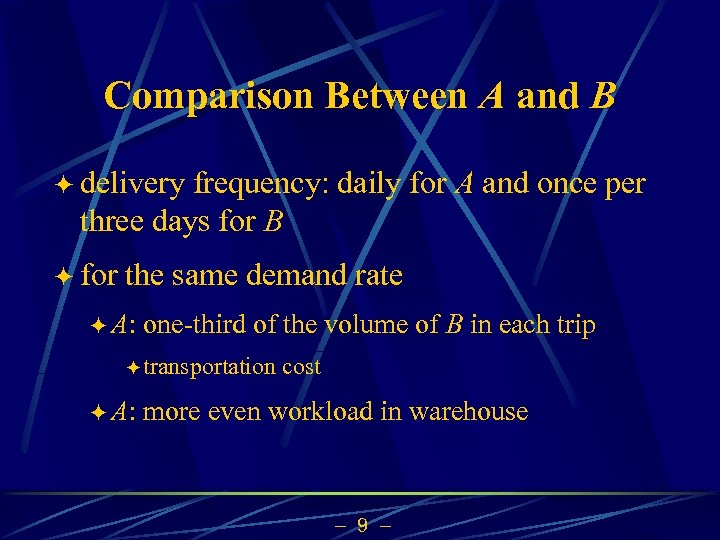 Comparison Between A and B ö delivery frequency: daily for A and once per three days for B ö for the same demand rate ö A: one-third of the volume of B in each trip ö transportation ö A: cost more even workload in warehouse 9