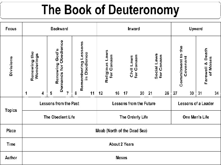 Outline of Deuteronomy • History of the Covenant (1: 1 – 4: 43) • Stipulations of the Covenant (4: 44 – 26: 19) – Moral Law (4: 44 – 11: 32) – Ceremonial Law (12: 1 – 16: 17) – Civil Law (16: 18 – 26: 19) • Ratification of the Covenant (27: 1 – 30: 20) • Leadership Succession Under the Covenant (31: 1 – 34: 20)