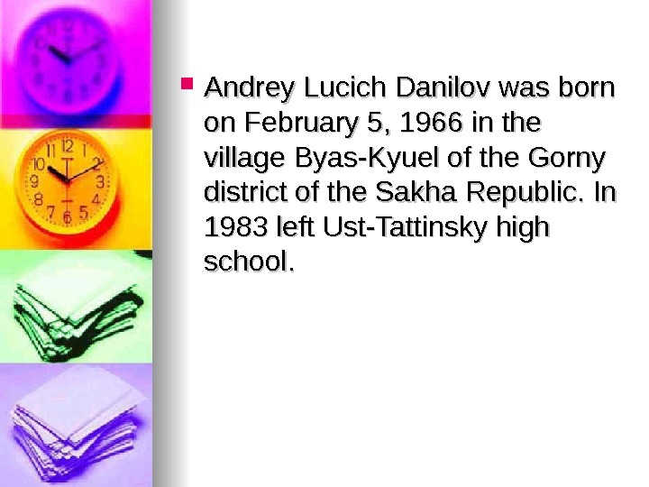 Andrey Lucich Danilov was born on February 5, 1966 in the village Byas-Kyuel of the Gorny district of the Sakha Republic. In 1983 left Ust-Tattinsky high school.