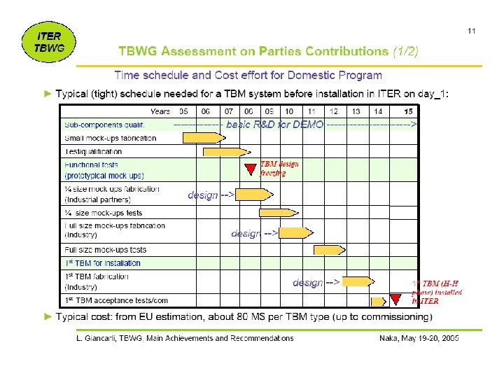 INFORMAL “Guess” and observations on the likely Costs • The Cost of ITER-TBM Program consists of three parts: 1. Cost of R&D 2. Cost of Mockup Facilities 3. Cost of the Test Articles (and ancillary equipment) to be delivered to ITER • Educated Guess (based on EU and Japanese “informal” estimates, prior exercises etc) – Cost of R&D: $40 M–$60 M total over 10 years ($4 M–$6 M per year) – Cost of Mockup Facilities: $10 M–$20 M total over 3– 5 years beginning a few years from now – Cost of Construction of first Test Article to be delivered to ITER: $2 M–$3 M total beginning in about 7 years – Cost of Ancillary Equipment to be delivered to ITER: TBD (probably a few million beginning in about 8 years) • The R&D cost will be the larger part of the total cost. But this R&D is actually the core of the base program anyway. ITER-TBM is the most important focus of Fusion Nuclear Technology over the next 30 years or so. Therefore, it should logically be the highest priority for the base program. Therefore, we expect most of the R&D can and should be covered by the base technology (but we have to examine of course whether current budgets for the base program are adequate). We need to prioritize the R&D, estimate the cost of the R&D over the next 10 years and compare it to current/projected base technology program funding. • The "Real new & additional" cost is the cost of mock up facilities, plus the cost of the "test articles" themselves. Spending on these does not start until a few years from now.