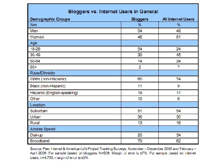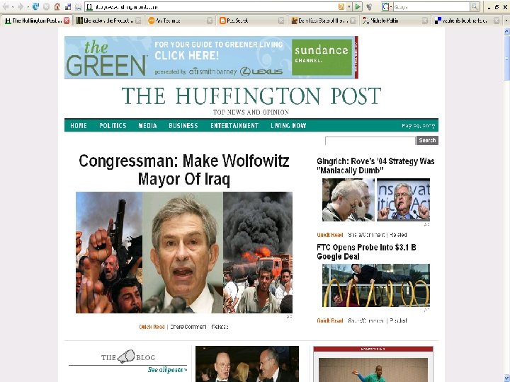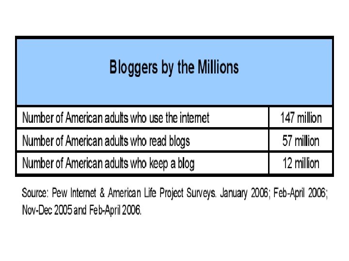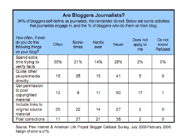 Examples: bloggers vs trad media • Trent Lott (2002) • Rathergate (2004) • Eason Jordan, Chief News Executive, CNN/Davos (“blog-mob”) (2005) • Ben Domenech/WP/plagiarism (2006) • 2006 Israel-Lebanon conflict photographs controversies (2006)