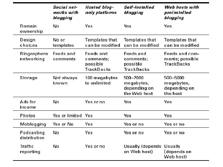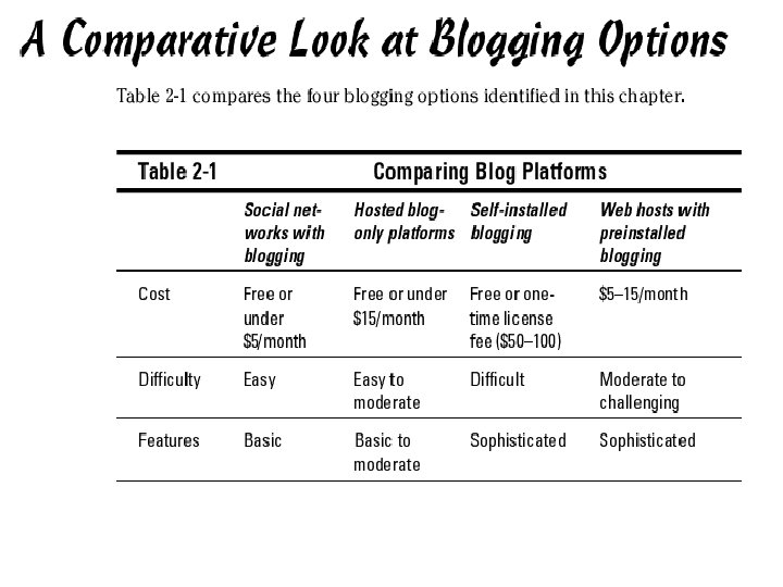 Four options • Social-networks with blogging (Live. Journal, My. Space, Yahoo’s 360 Degrees) • Hosted blog-only platforms (i. e. Blogger) • Self-installed blogging (Moveable Type, Wordpress, etc) • Web-hosts with pre-installed blogging (most of the professional blogs)