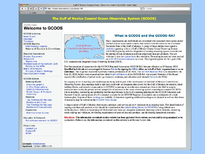 Actions 7 • A Board of Directors for the GCOOS Regional Association has been elected and has held its initial meeting in August 2005.