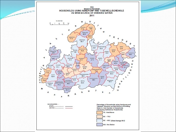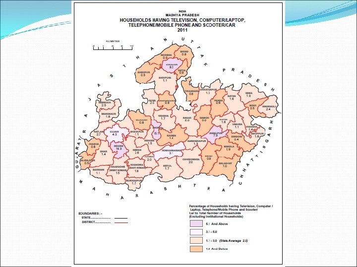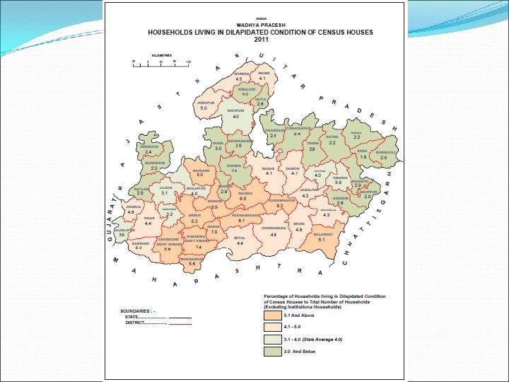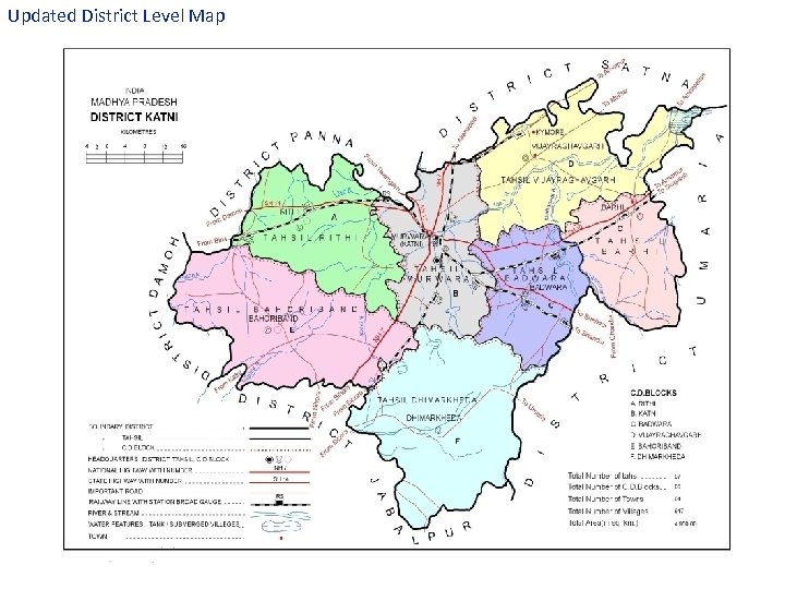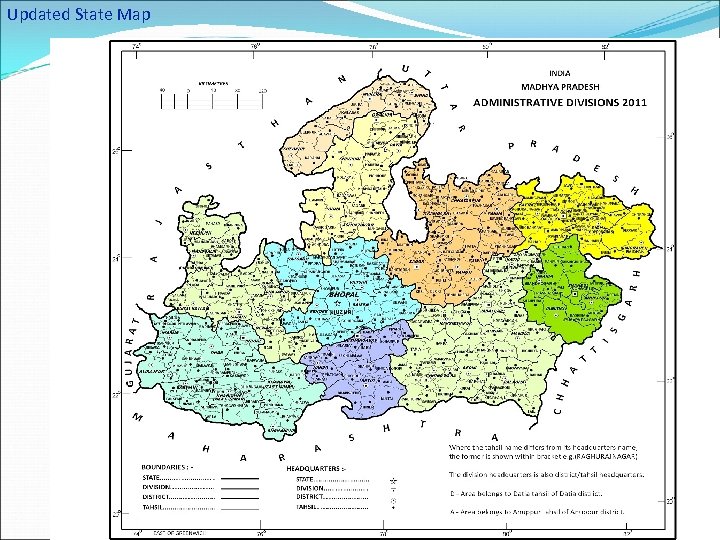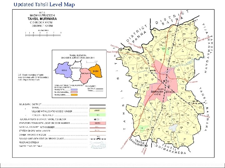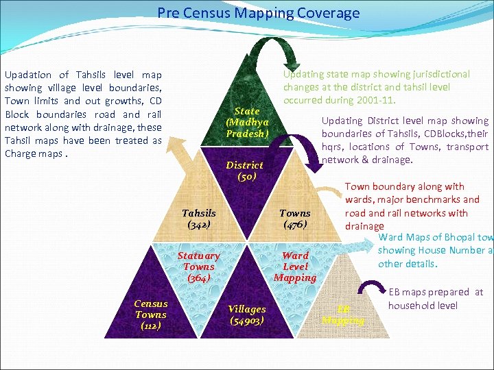 Pre Census Mapping Coverage Upadation of Tahsils level map showing village level boundaries, Town limits and out growths, CD Block boundaries road and rail network along with drainage, these Tahsil maps have been treated as Charge maps. State (Madhya Pradesh) Updating state map showing jurisdictional changes at the district and tahsil level occurred during 2001 -11. Updating District level map showing boundaries of Tahsils, CDBlocks, their hqrs, locations of Towns, transport network & drainage. Districts (50) Tahsils (342) Statuary Towns (364) Census Towns (112) Towns (476) Ward Level Mapping Villages (54903) Town boundary along with wards, major benchmarks and road and rail networks with drainage Ward Maps of Bhopal tow showing House Number an other details. EB Mapping EB maps prepared at household level