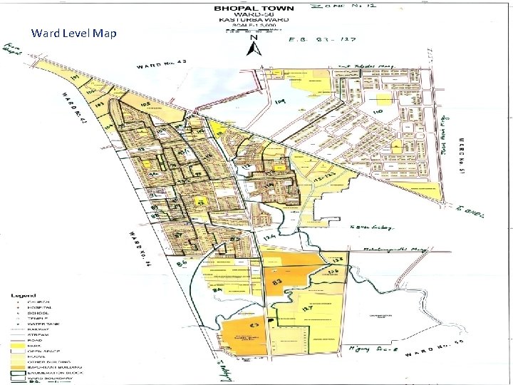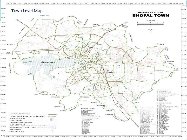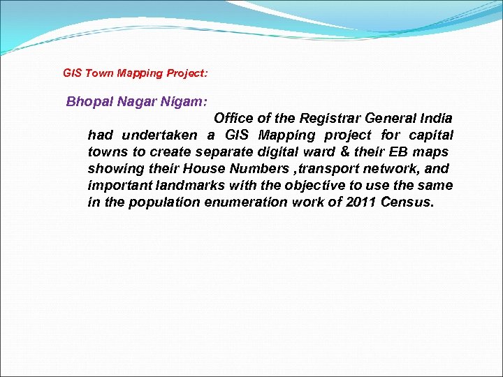 GIS Town Mapping Project: Bhopal Nagar Nigam: Office of the Registrar General India had undertaken a GIS Mapping project for capital towns to create separate digital ward & their EB maps showing their House Numbers , transport network, and important landmarks with the objective to use the same in the population enumeration work of 2011 Census.