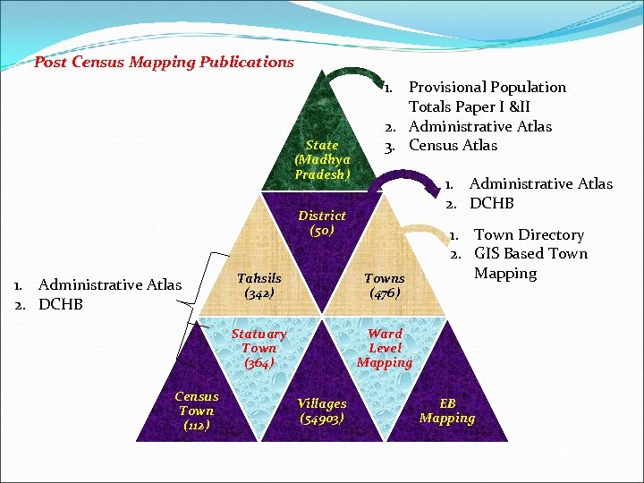 Post Census Mapping Publications State (Madhya Pradesh) 1. Provisional Population Totals Paper I &II 2. Administrative Atlas 3. Census Atlas 1. Administrative Atlas 2. DCHB District (50) Census Town (112) Tahsils (342) Towns (476) Statuary Town (364) 1. Administrative Atlas 2. DCHB 1. Town Directory 2. GIS Based Town Mapping Ward Level Mapping Villages (54903) EB Mapping