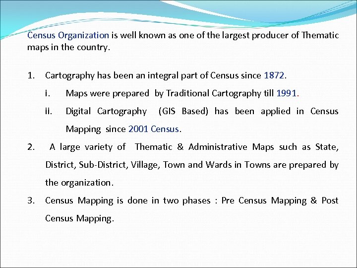 Census Organization is well known as one of the largest producer of Thematic maps in the country. 1. Cartography has been an integral part of Census since 1872. i. Maps were prepared by Traditional Cartography till 1991. ii. Digital Cartography (GIS Based) has been applied in Census Mapping since 2001 Census. 2. A large variety of Thematic & Administrative Maps such as State, District, Sub-District, Village, Town and Wards in Towns are prepared by the organization. 3. Census Mapping is done in two phases : Pre Census Mapping & Post Census Mapping.