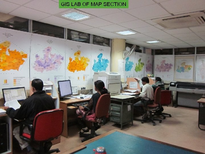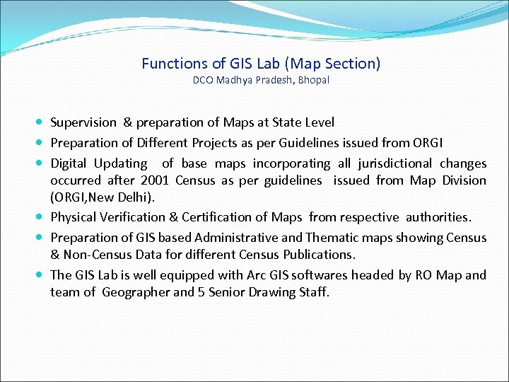 Functions of GIS Lab (Map Section) DCO Madhya Pradesh, Bhopal Supervision & preparation of Maps at State Level Preparation of Different Projects as per Guidelines issued from ORGI Digital Updating of base maps incorporating all jurisdictional changes occurred after 2001 Census as per guidelines issued from Map Division (ORGI, New Delhi). Physical Verification & Certification of Maps from respective authorities. Preparation of GIS based Administrative and Thematic maps showing Census & Non-Census Data for different Census Publications. The GIS Lab is well equipped with Arc GIS softwares headed by RO Map and team of Geographer and 5 Senior Drawing Staff.